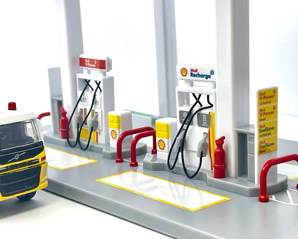 Dale más realismo y valor a tu colección con este increíble playset Shell a escala 1/64, ideal para recrear escenas de estación de servicio y transporte pesado. Este set incluye una estación Shell, un camión cisterna Volvo Shell y un camión grúa Volvo Shell, logrando una presentación muy atractiva para coleccionistas y fanáticos de los dioramas.